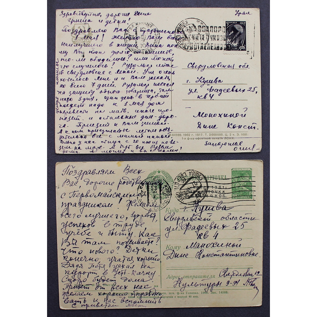 СССР пара почтовых открыток "1 МАЯ". Юдин (1962), Киселев (1960)