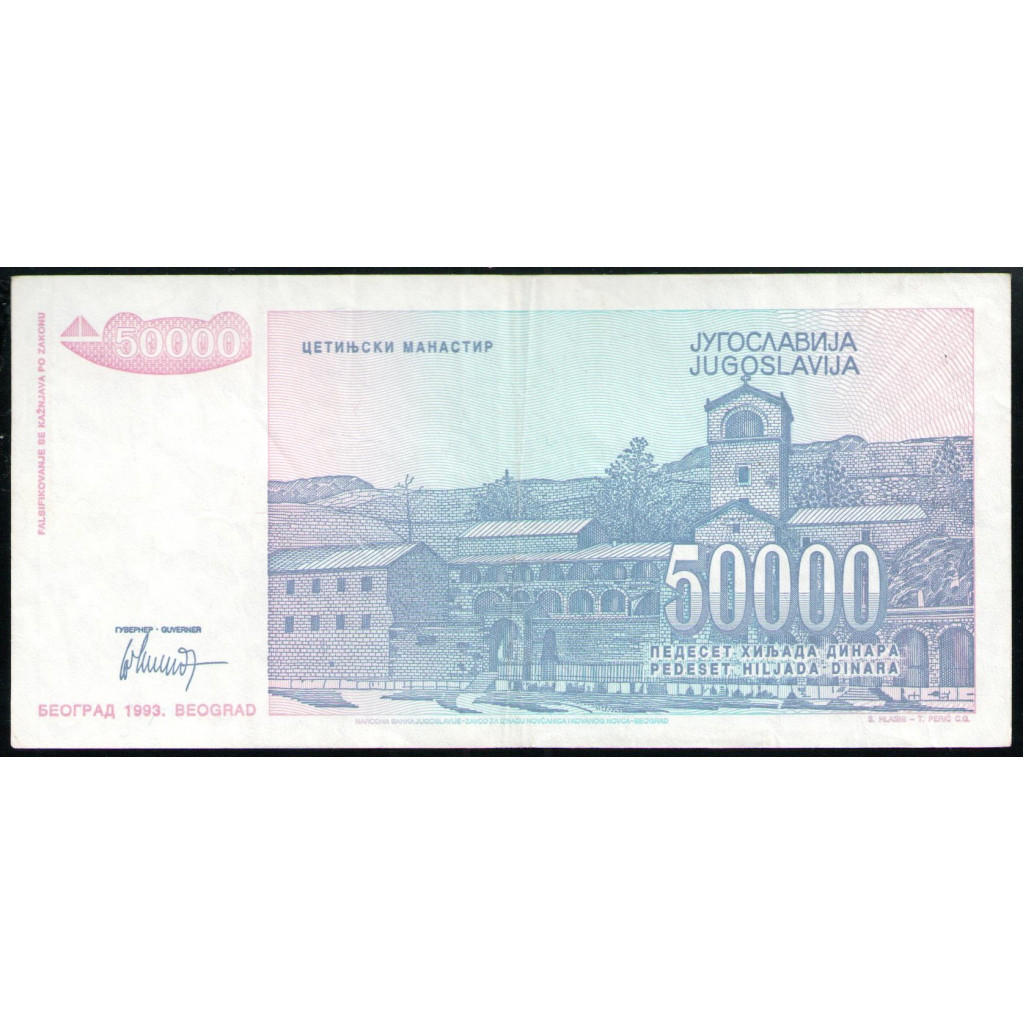 Югославия 50000 Динаров 1993 год VF Петр 2 Петрович Негош князь епископ Черногории Монастырь Цетинье