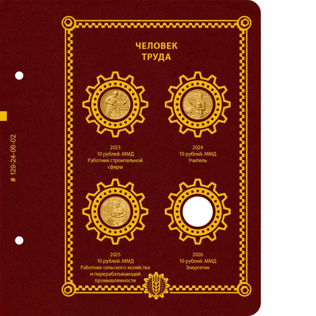 Альбом для коллекции памятных монет «Человек труда» номиналом 10 рублей с латунным гальваническим покрытием. В настоящий момент Центральный банк России выпускает по 1-2 монете в год, начиная с 2020. Надеемся, что серия будет иметь длительное продолжение.