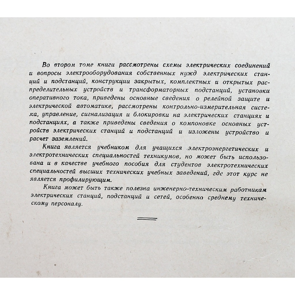 Во втором томе рассмотрены схемы электрических соединений и вопросы электрооборудования собственных нужд электрических станций и подстанций, конструкции закрытых, комплектных и открытых распределительных устройств и трансформаторных подстанций, установки оперативного тока, приведены основные сведения о релейной защите и электрической автоматике, рассмотрены контрольно-измерительная система, управление, сигнализация и блокировки на электрических станциях и подстанциях, а также приведены сведения о компоновке основных устройств электрических станций и подстанций и изложены устройство и расчет заземлений.