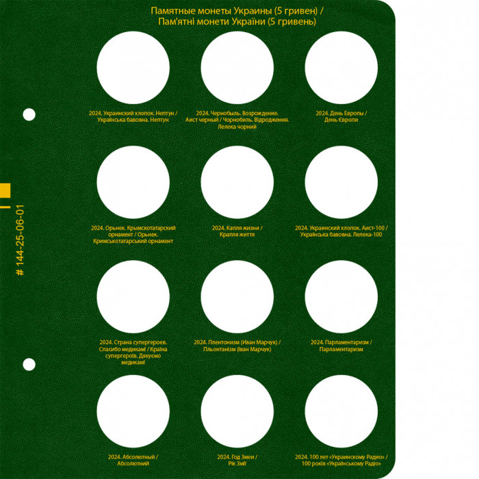 Монеты располагаются в том порядке, в котором они выпускались Национальном банком Украины, независимо от того к какой серии они относятся. В рамках одного года в некоторых случаях хронология выпуска нарушалась с целью расположить монеты из одного металла на одной строке. Под каждой ячейкой указываются год и название монеты на русском и украинском языках. Номинал на двух языках указывается в заголовке страницы.