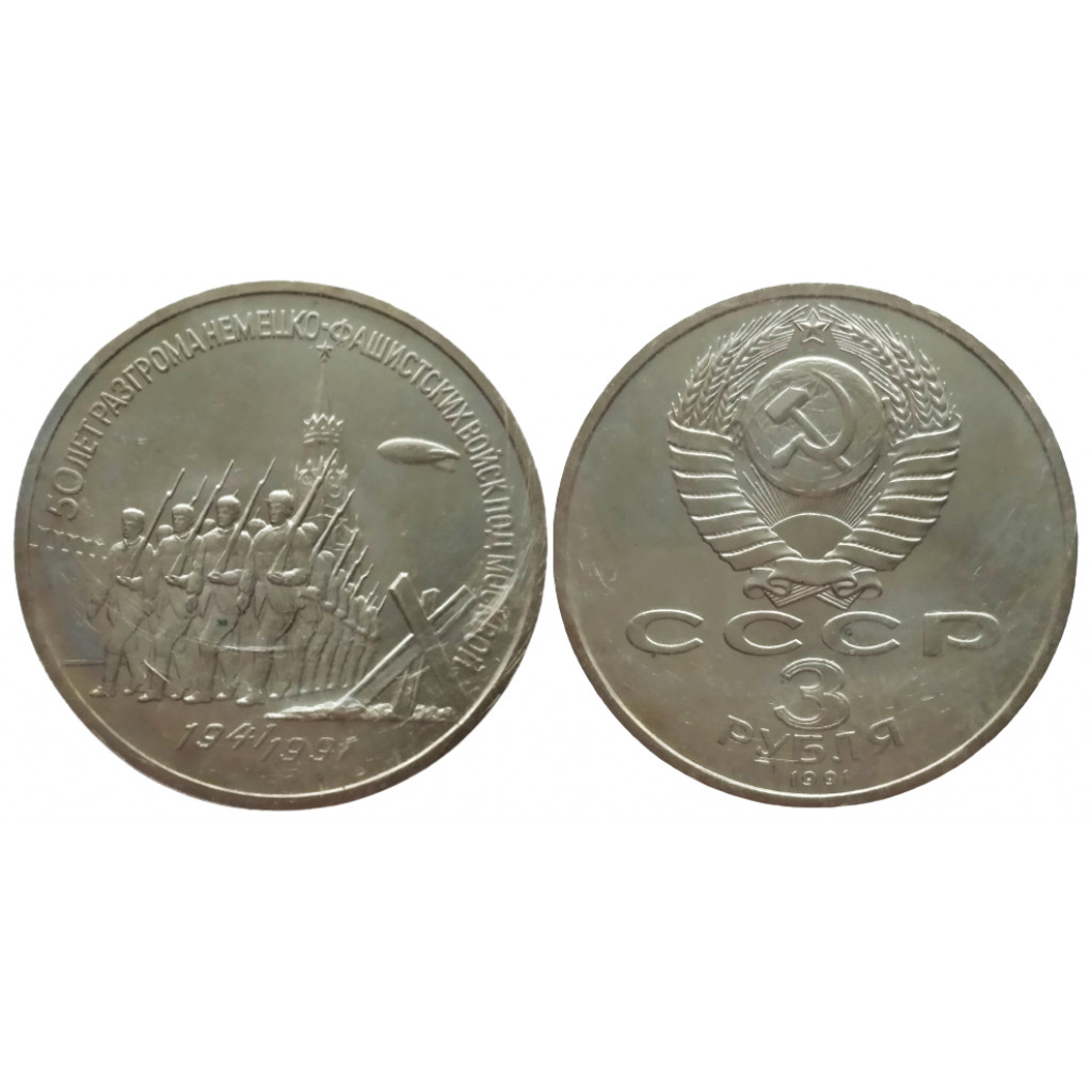 СССР 3 рубля 1991 PROOF Y# 301 50 лет победы в сражении под Москвой в запайке