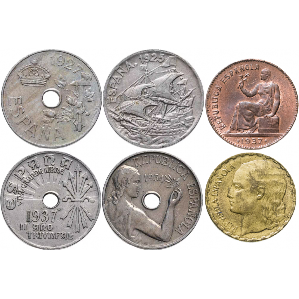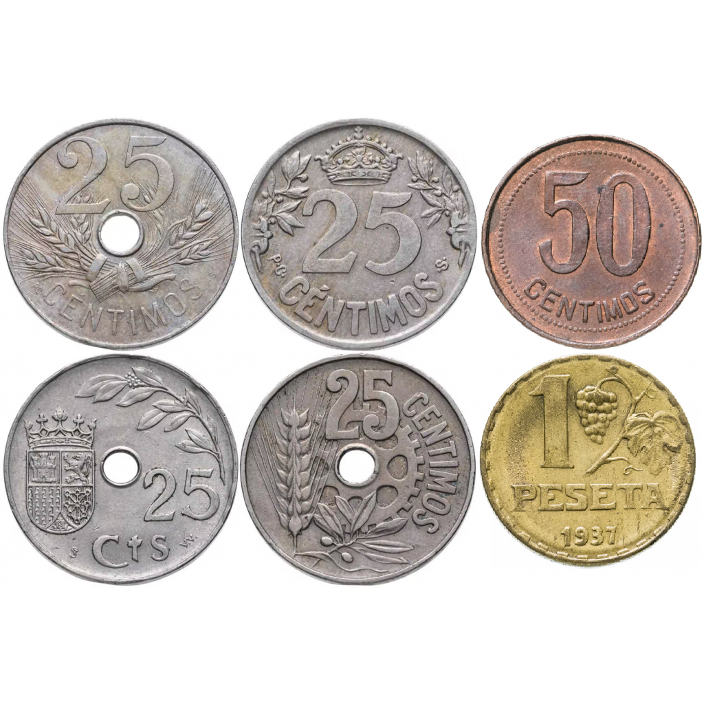 Испания 25 50 сентимо 1 песета 1925-1938 год Набор 6 монет