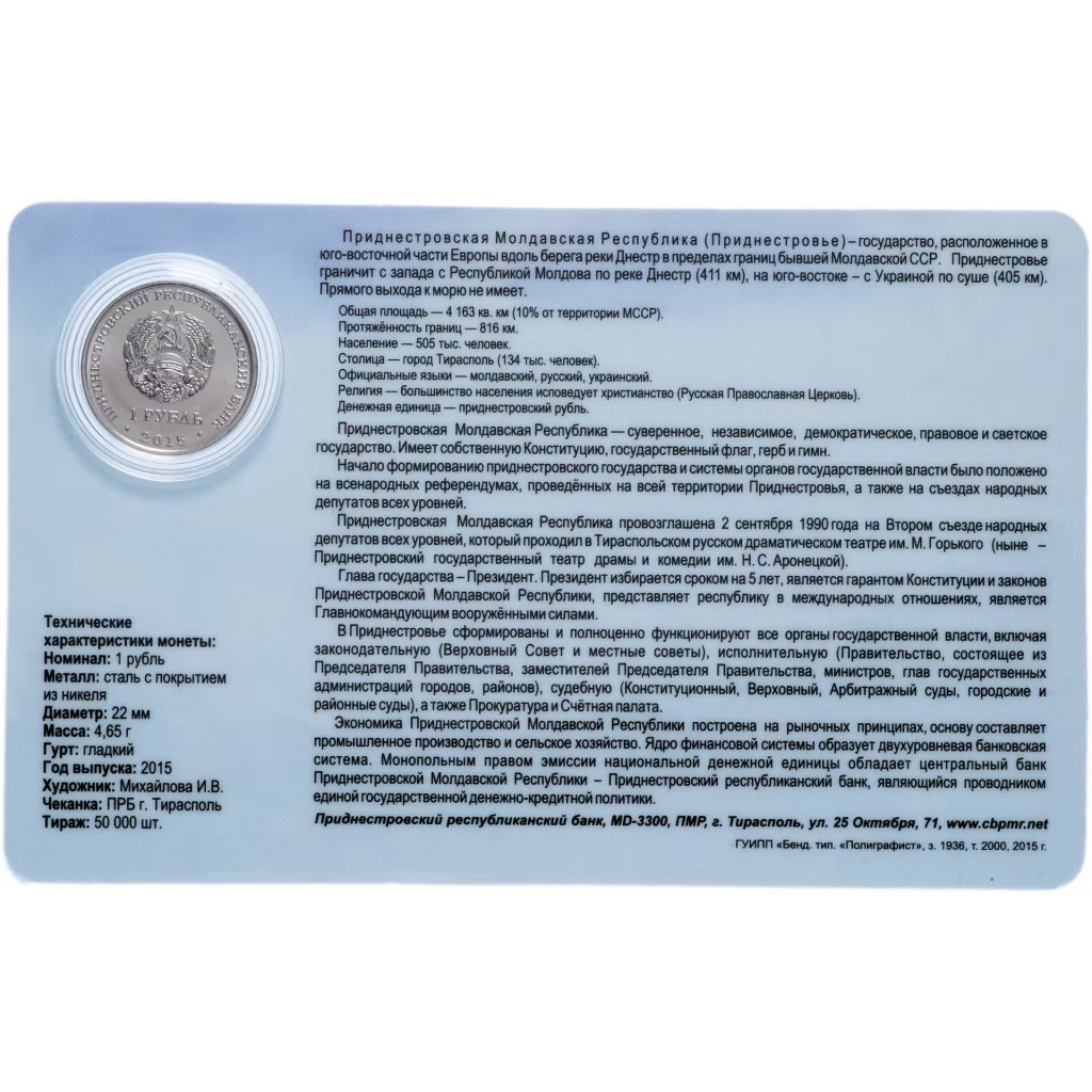 Приднестровье 1 рубль 2015 год 25 лет образования ПМР в буклете UNC