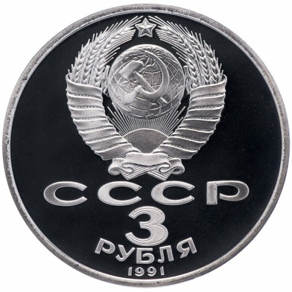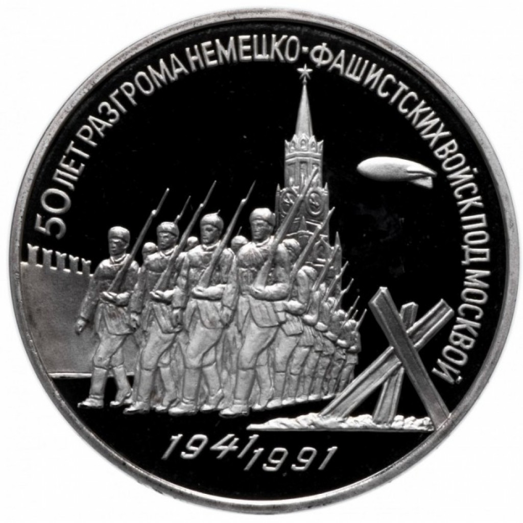 СССР 3 рубля 1991 год PROOF 50 лет победы в сражении под Москвой в запайке Y# 301