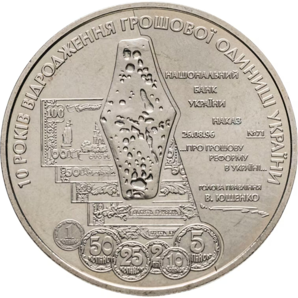 Украина 5 гривен 2006 год 10 лет реформе денежной системы KM# 413